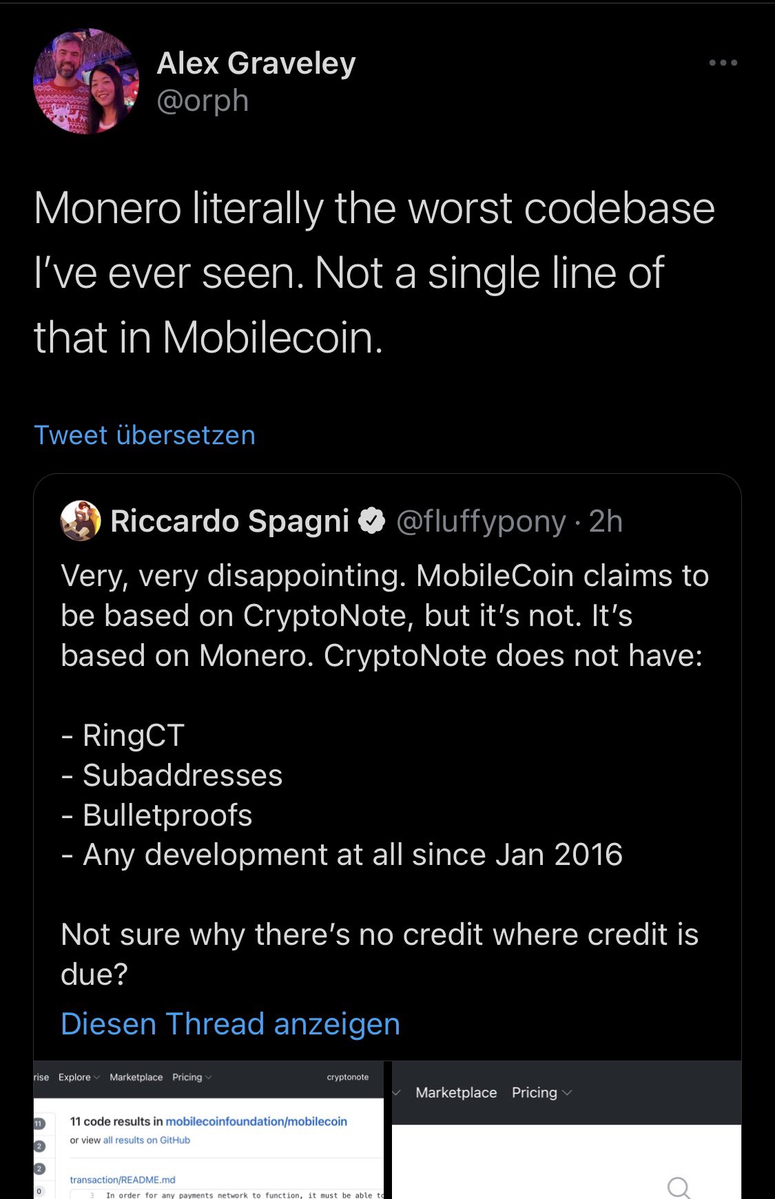| | “Monero the worst codebase I've ever seen. Not a line of that in Mobilecoin.” (twimg.com) |