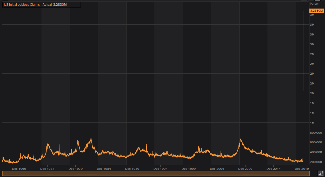 3. This is nearly 5x (!) the prior record of 671K new jobless claims from 1982, and redefines the scale for jobless claims. [1]