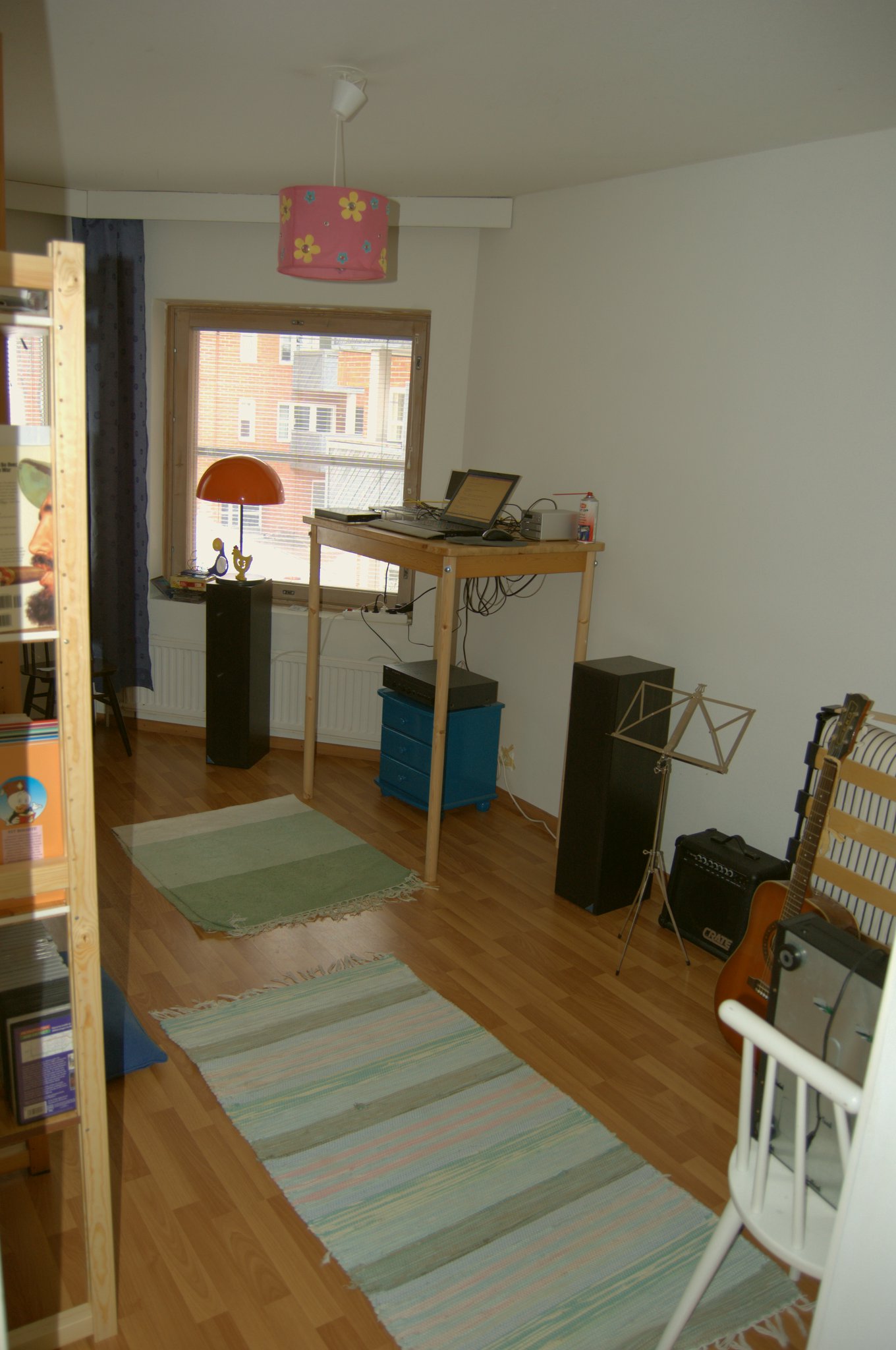 Built the desk from an ordinary kitchen table by replacing the legs with longer ones, costing roughly 30€ or so at the hardware store. Here's a picture: http://yason.kapsi.fi/tmp/codingdesk.jpg