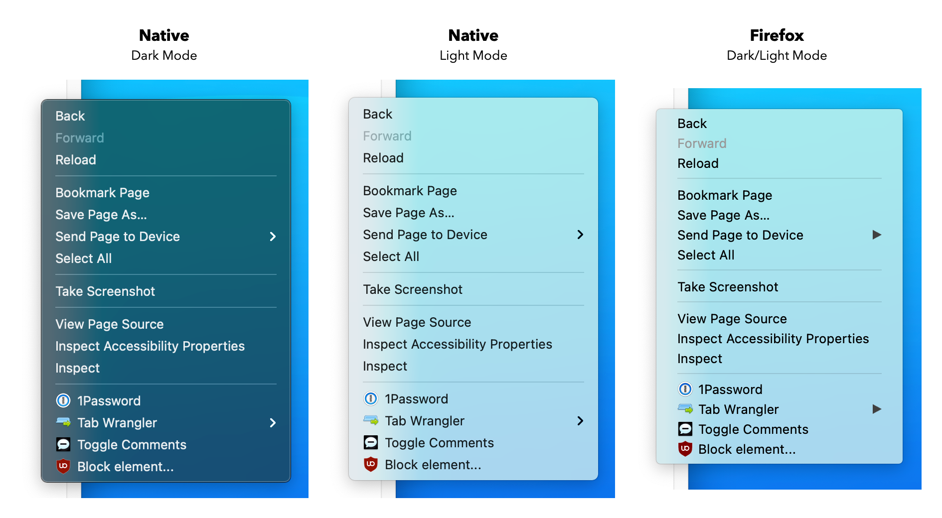 For behavior difference, for example: when navigating sub-menu items, macOS uses cursor velocity and cursor direction to determine if user is trying to go to submenu and immediately dismiss it if user is not. Firefox context menu uses a delay to archive similar effect. (To test this: open a sub-menu in a context menu, then move the cursor up. macOS native menu dismiss immediately, where old Firefox has a small delay before it is dismissed.)
